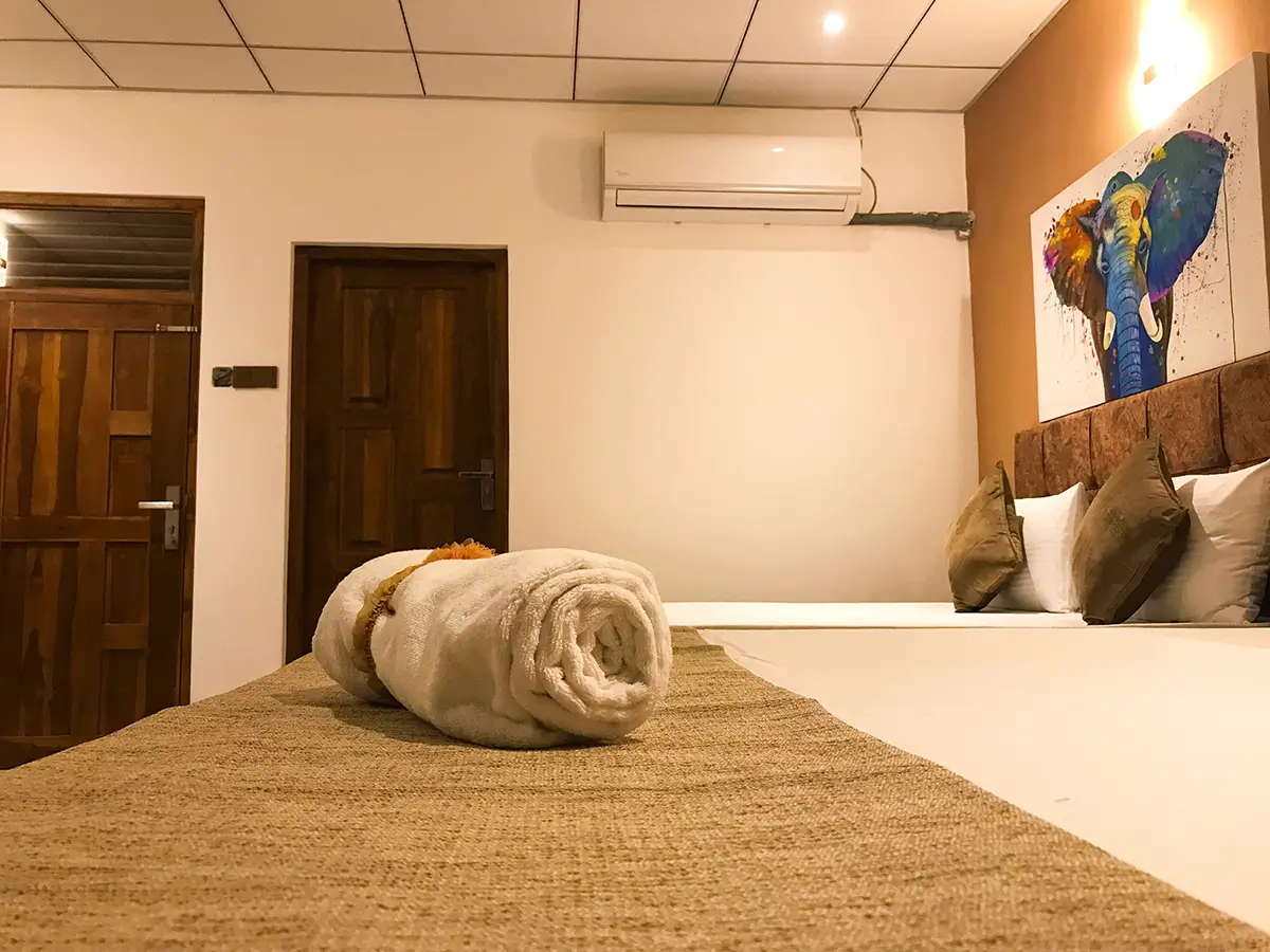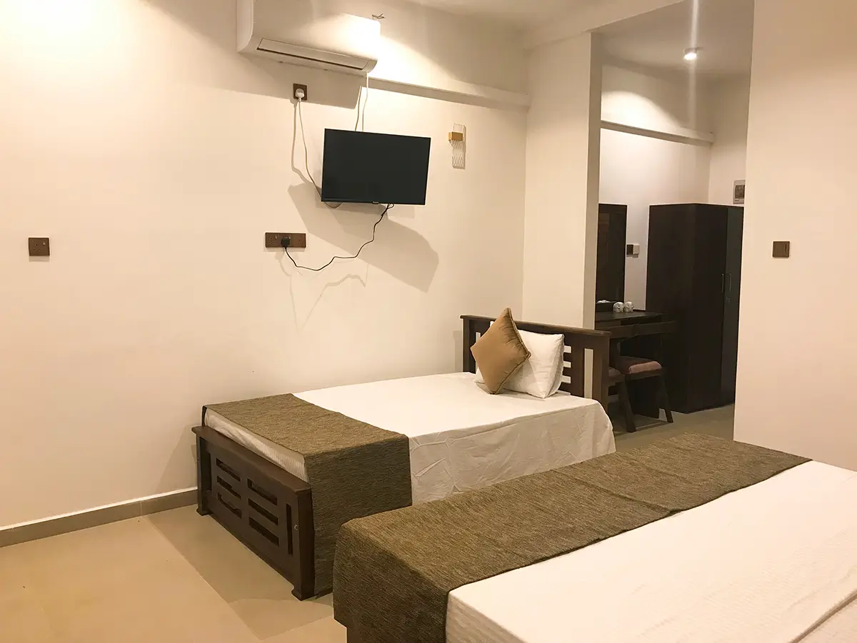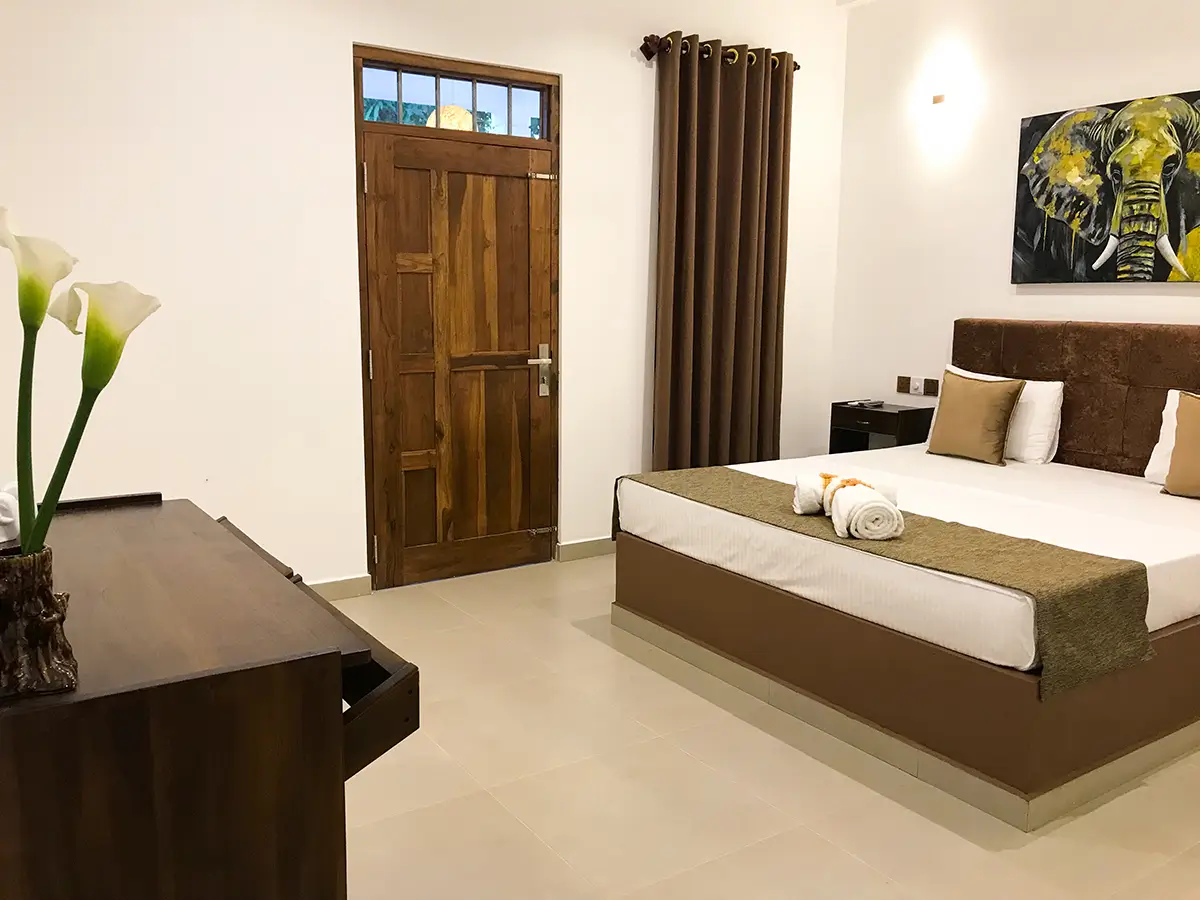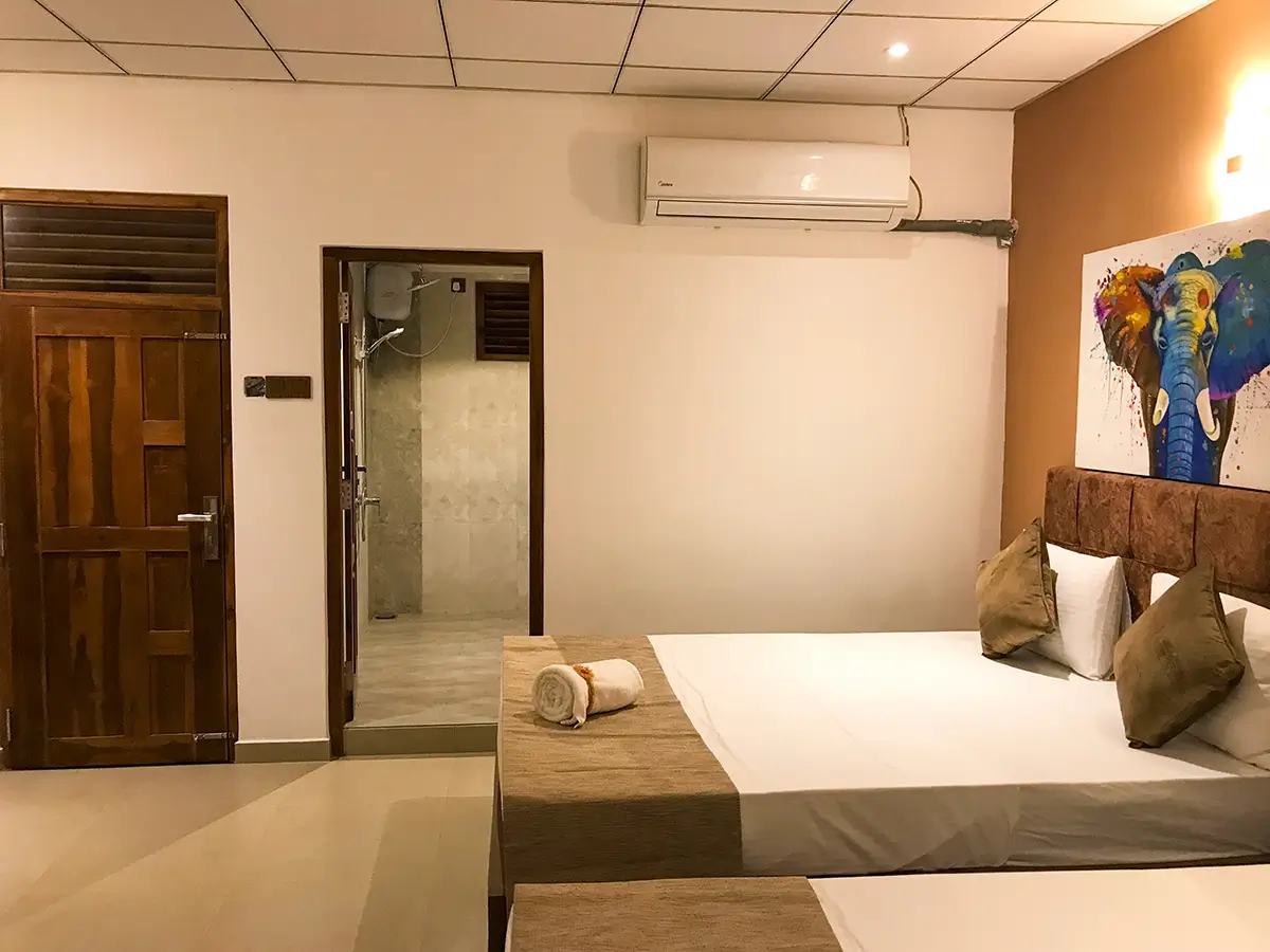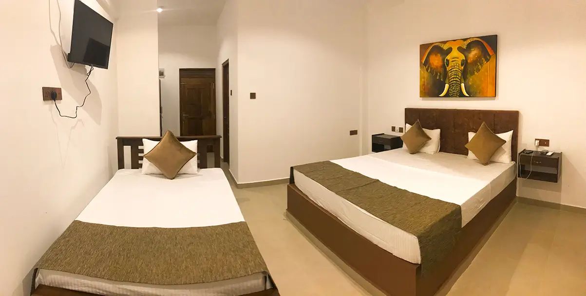 A comfortable triple room featuring one king-size bed and one single bed, ideal for small families or groups. Enjoy modern amenities, a relaxing atmosphere, and the perfect space to unwind after exploring Udawalawe.