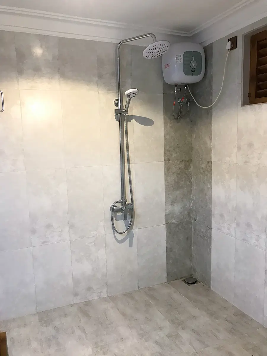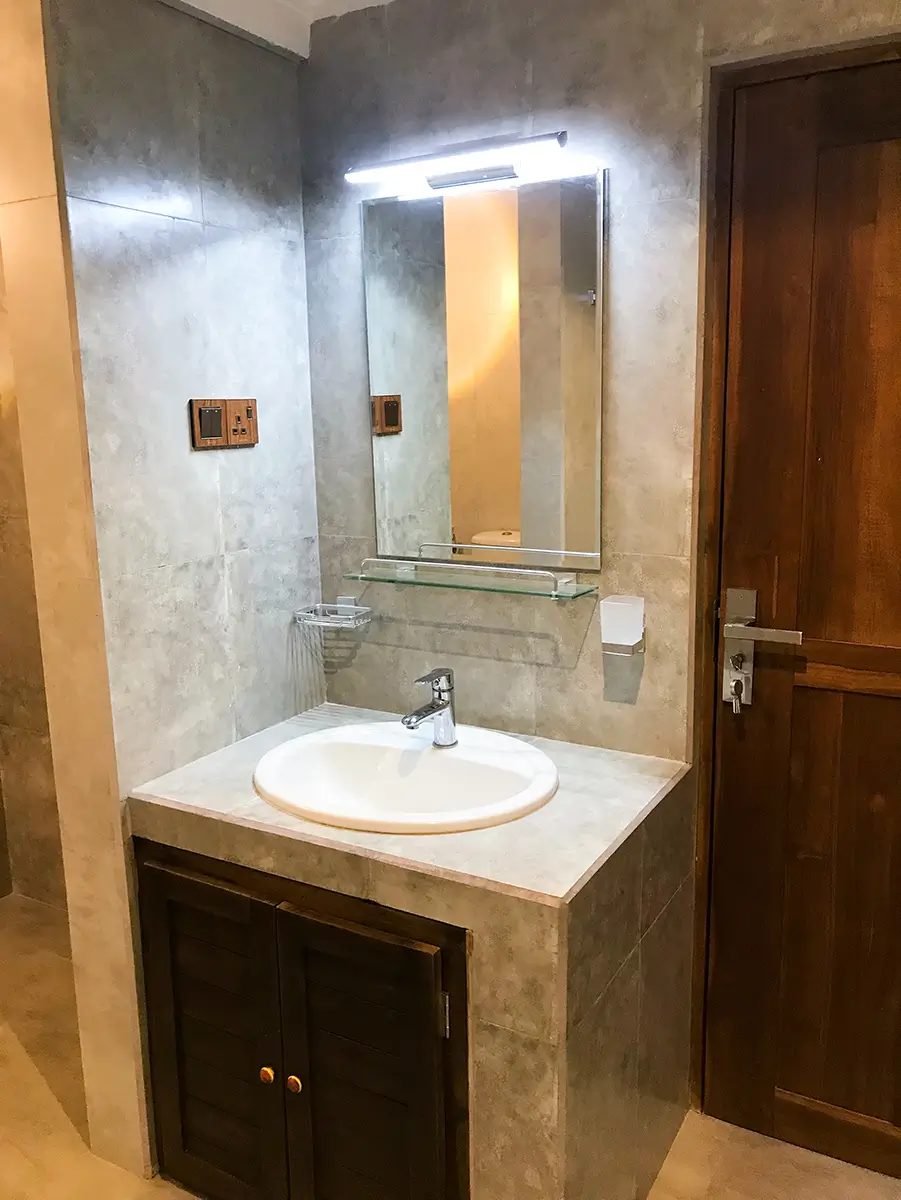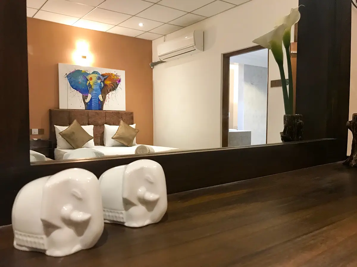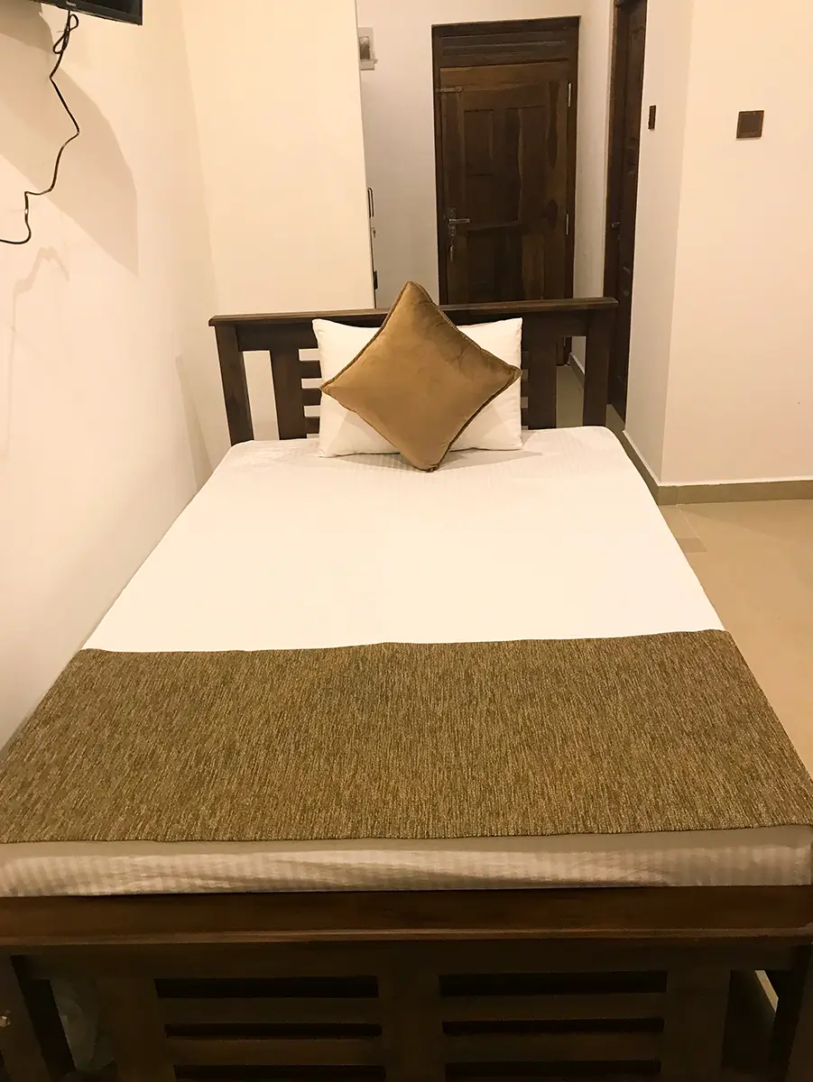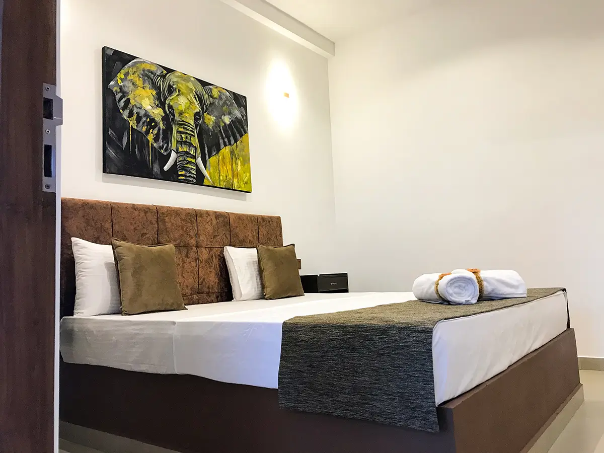 A comfortable triple room featuring one king-size bed and one single bed, ideal for small families or groups. Enjoy modern amenities, a relaxing atmosphere, and the perfect space to unwind after exploring Udawalawe.